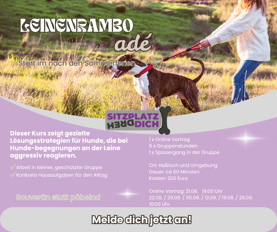 Dieser Kurs ist ideal für alle Hunde, die an der Leine mit Stress, Aggression, Unsicherheit oder starkem Ziehen reagieren. Ganz gleich, ob dein Hund andere Hunde, Menschen oder Reize wie Fahrräder anbellt – wir holen euch genau dort ab, wo ihr steht.