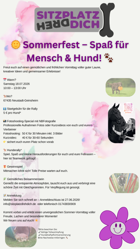 - Samstag 18. Juni 10 -13 Uhr Sommerfest mit Hundefotograf und Hunderally