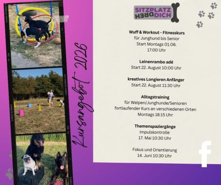 Vom ersten Welpenkurs über das Training junger Hunde bis hin zu kreativen Beschäftigungen wie Longieren, Nasenarbeit, Dogdance oder Tricks.